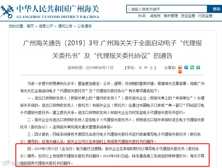 6月11日,广州海关发布通告,自2019年8月1日起,海关不再接收纸质代理报关委托书。7月31日前为过渡期,报关企业在申报时既可以填写电子代理报关委托书,也可以上传纸质代理报关委托书扫描件。