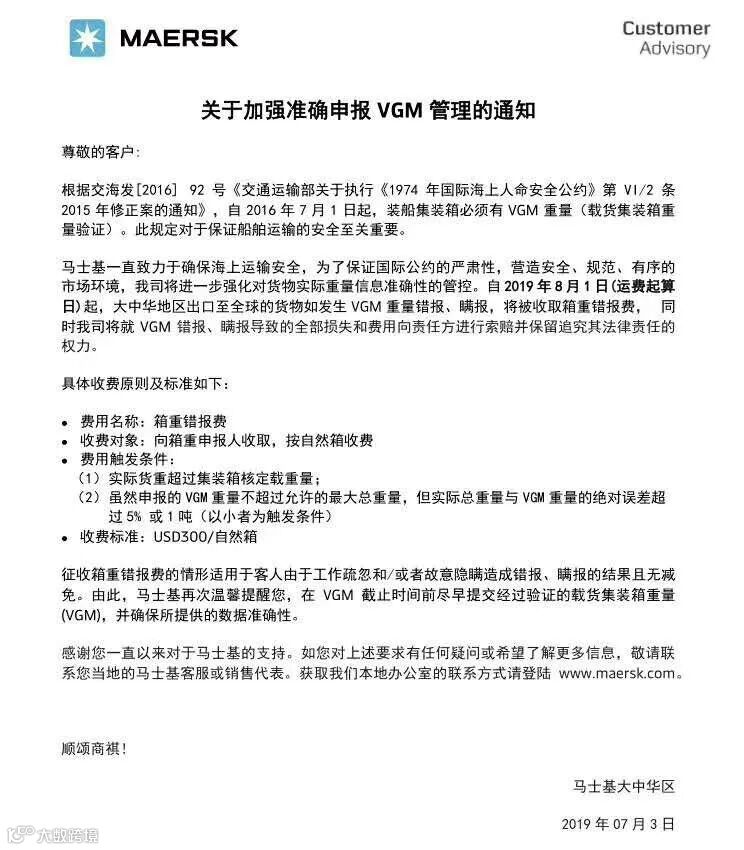 与此同时,对于VGM申报,马士基也出台了规定!自2019年8月1日(运费起算日)起,大中华地区出口至全球的货物如发生VGM重量错报、瞒报,将被收取箱重错报费,费用为300美金/自然箱。