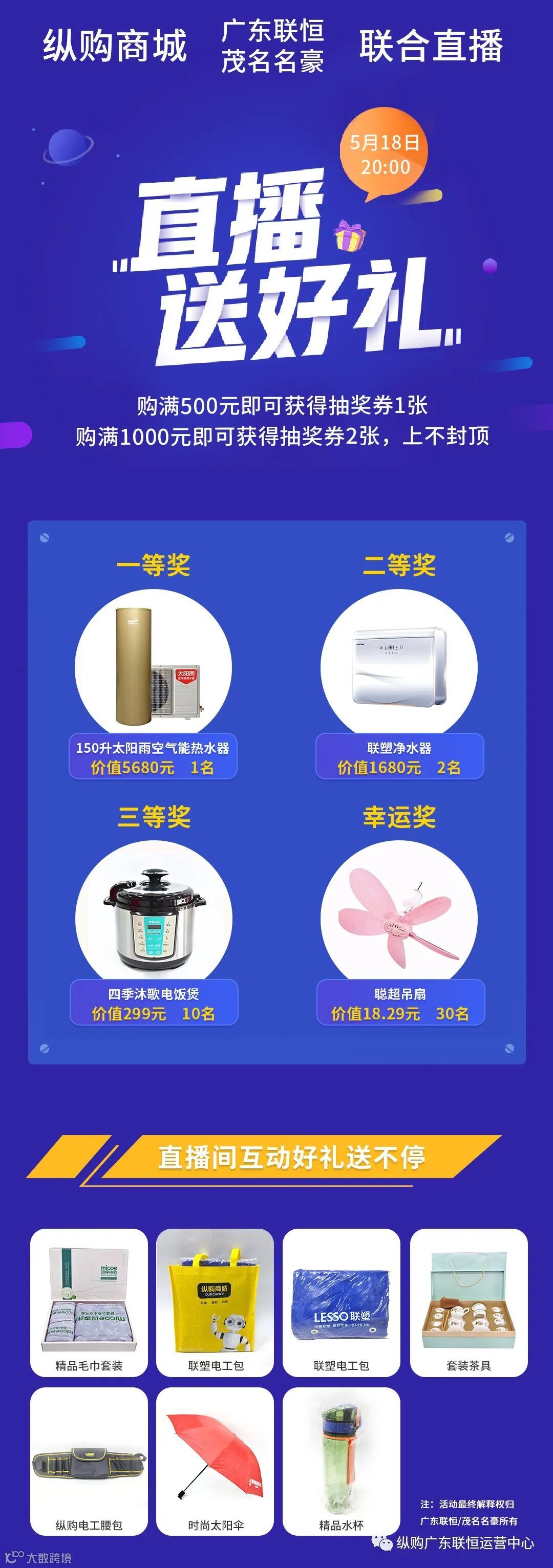 重磅惊喜来袭!联恒纵购直播间!5月18日晚上8点-10点,品牌齐聚.惊爆秒杀,豪华大礼送!送!送!
