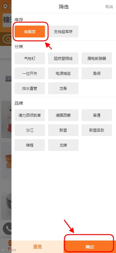 2. 筛选页面,点击【有现货】按钮,点击下方确认按钮即可