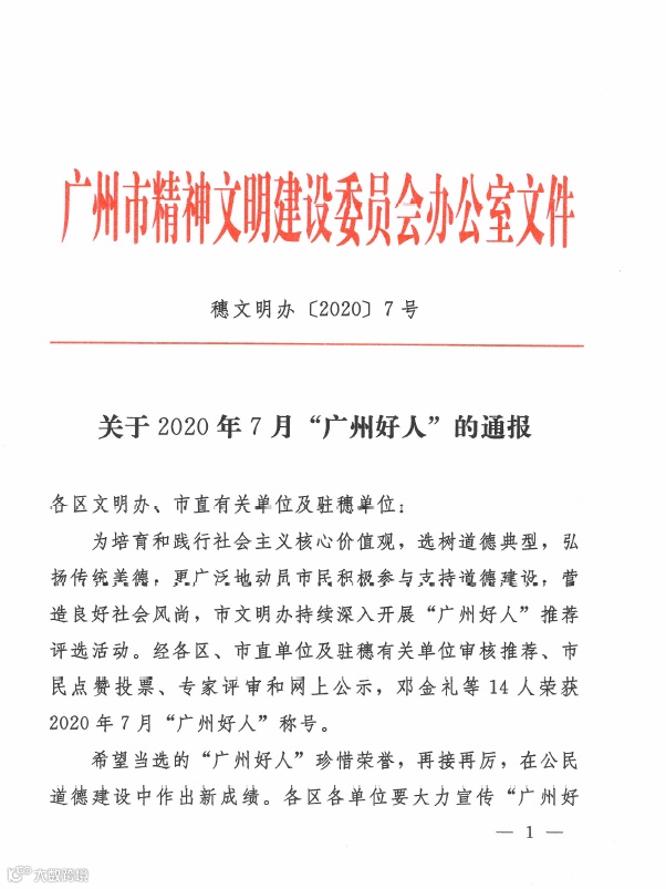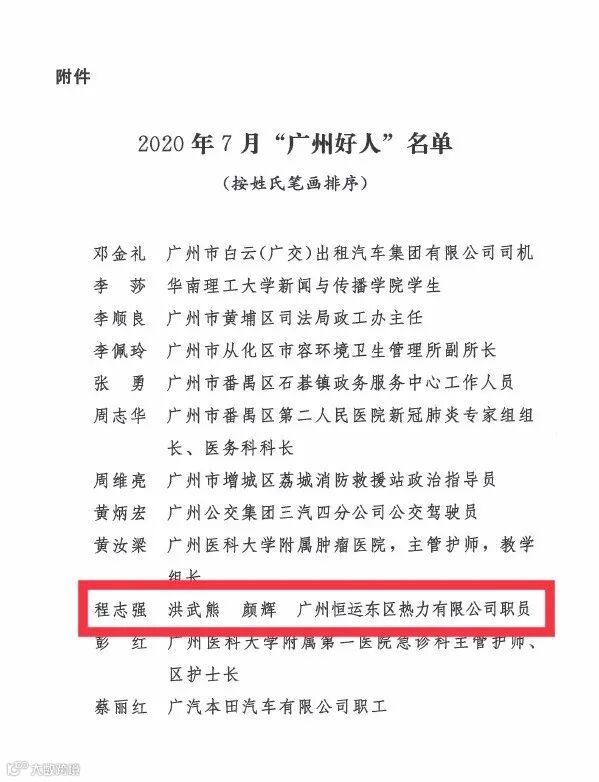 2020年8月10日,由广州市精神文明建设委员会办公室组织开展的2020年7月“广州好人”评选活动结果揭晓,经各区、市直单位及驻穗有关单位审核推荐、市民点赞投票、专家评审和网上公示,共有14人荣登广州好人榜,其中在“5.22”特大暴雨中勇救8名群众的恒运集团下属热力公司程志强、洪武熊、颜辉3名员工位列其中!