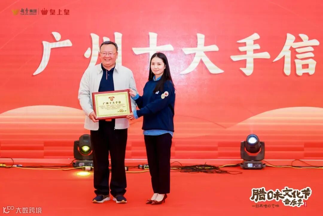 广州十大手信,不仅展示了本土特色产品,更是文化传承的桥梁,引领着人们领略广州的风采与底蕴。广州老字号协会会长苏广丰向皇上皇集团副总经理罗娟颁发了“广州十大手信”荣誉牌匾。这不仅是对皇上皇品牌的认可,更是前进的激励。