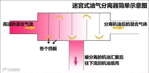流速较高的油雾进入迷宫式分离器会撞击在迷宫挡板上,渐渐汇集成比较重的机油油滴。在重力作用下油滴沉淀到管壁上并在机油回流管中聚集,流回曲轴箱。迷宫式油气分离器的效率相对较低,经处理后的油雾不够彻底。剩余气体可通过管道导入外部的油气分离器进一步分离。.