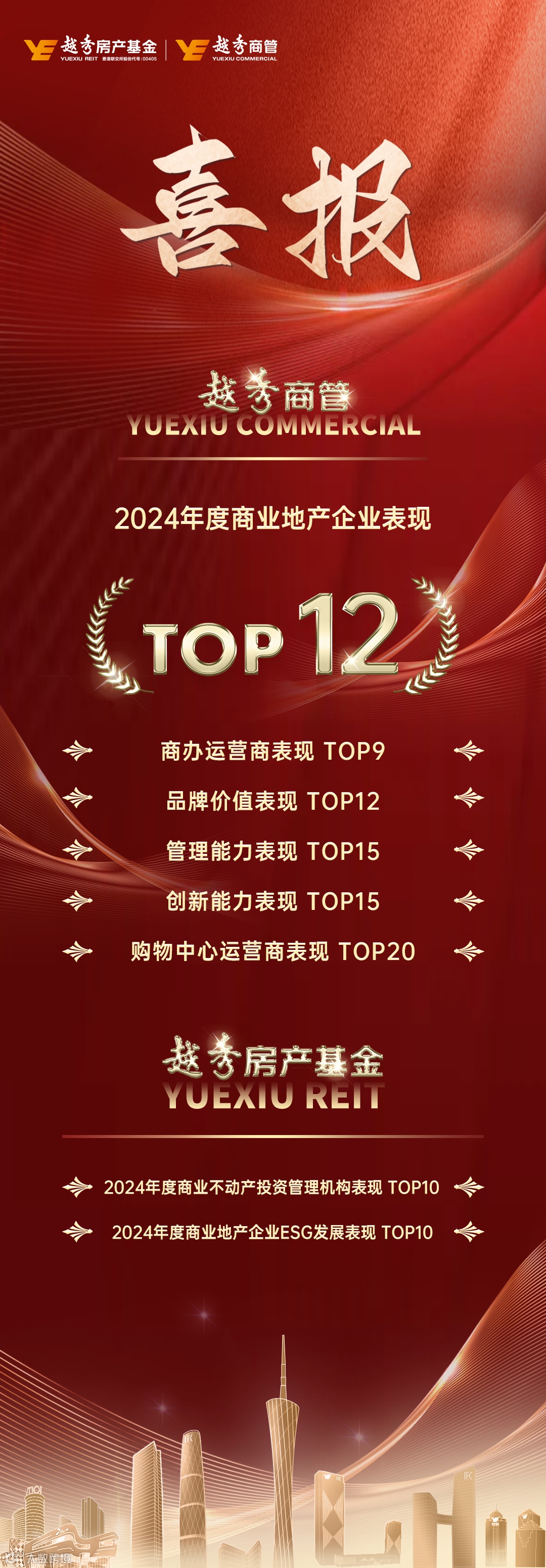 凭借深耕核心城市的规模化布局、差异化的产品能力、体系化的运营管理能力,越秀商管荣获2024年度商业地产企业表现TOP12。