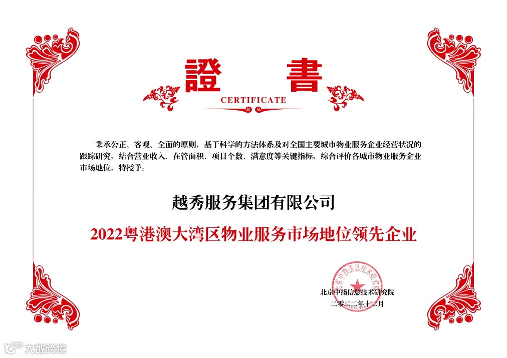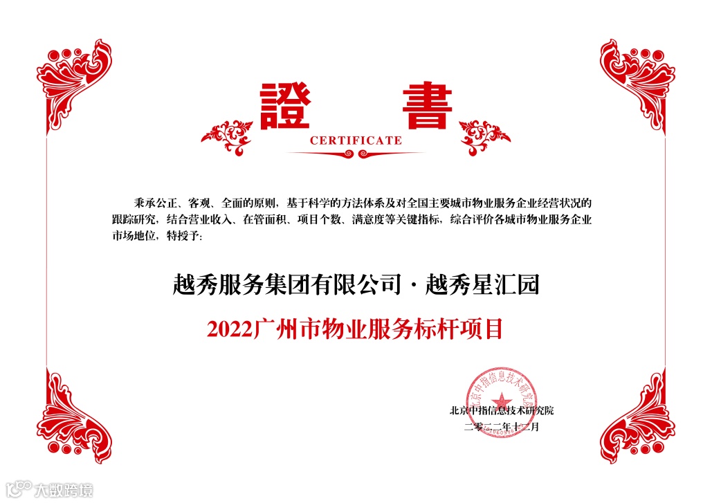 凭借深耕大湾区多年的物业服务经验及多业态服务优势,越秀服务在本次会议中荣膺“2022粤港澳大湾区市场地位领先企业TOP5”奖项,在管的住宅项目——越秀星汇园(广州)亦凭借高品质服务标准和先进的智慧科技水平荣获“2022广州市物业服务标杆项目TOP1”的称号。