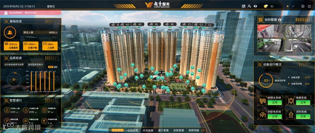 越秀服务一直致力于深化智能化服务改革,将科技融入传统物业服务,更好地服务生活。基于数字孪生技术,越秀服务研发了集“视、管、控、防”为一体的智慧社区管控平台,实现车行智能管理、人行智能管理、社区智能监控、工作人员智能巡更、智能社区全管控、设备智能管理和智能运营分析七大功能,有效转变社区管理与服务模式,增强协作与资源调度能力。这个智慧社区管控平台联动1个IOT平台、多个业务系统、近百个监控摄像头,形成了“虚拟现实+实时画面+数据看板+工单联动”的新型管理模式,实现社区管控智能化、全景化、平台化、数字化。