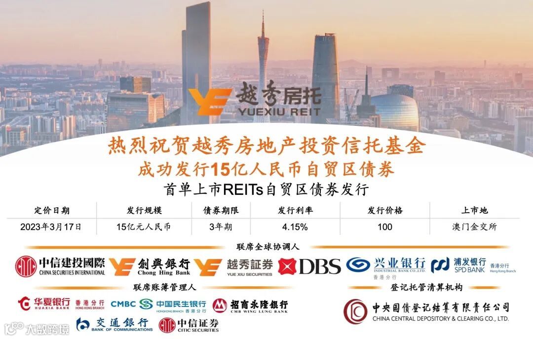 越秀房地产投资信托基金(「越秀房托」,股份代号:00405)连同越秀房托资产管理有限公司(作为越秀房地产投资信托基金管理人,或「房托基金管理人」),欣然宣布,于 2023 年 3 月 17 日成功发行 15 亿元 3 年期自贸区离岸人民币债券,票面利率仅4.15%。