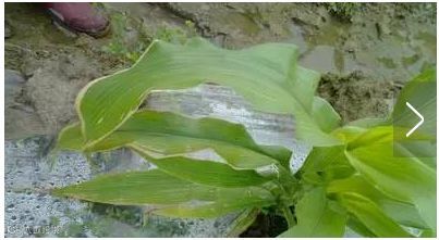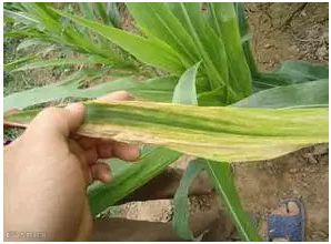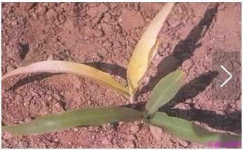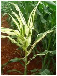 玉米苗叶片细窄,株形矮小,叶片出现黄绿相间的条纹,严重时叶片呈深褐色,最后焦枯死亡。症状从下部叶片开始,逐渐向上部叶片转移,影响产量较大,易发生倒伏。