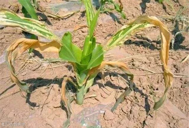 3、高温干旱 玉米苗期遇有较长时间缺雨,造成大气和土壤干旱,不能在土壤缺水时满足玉米生长发育的需要易造成死苗。玉米苗期干旱,幼株的上部叶片卷起,并呈暗色。严重时叶片边缘或叶尖变黄,随后下部叶片的叶尖端或叶缘干枯。在疏松沙土上幼苗干枯而死。