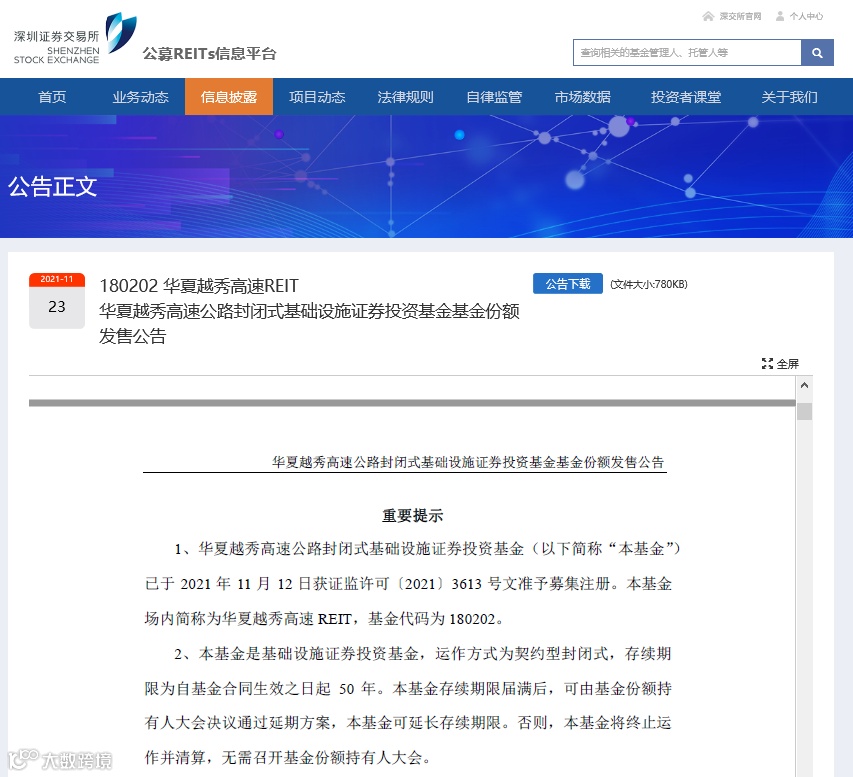 2021年11月23日,越秀集团旗下越秀交通公募REITs项目“华夏越秀高速公路封闭式基础设施证券投资基金”(下称“华夏越秀高速REIT”,基金代码180202)发布基金发售公告,基金募集期为2021年11月29日至2021年11月30日。基金管理人、财务顾问根据询价报价情况,审慎合理确定基金的份额发售价格为7.100 元/份,对应发售规模为21.3亿元。