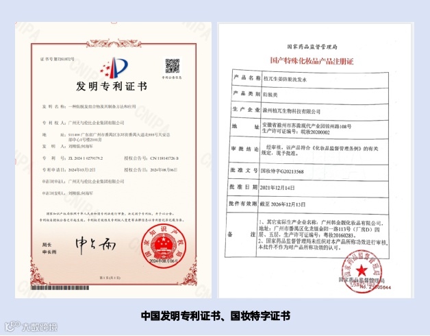 2024年,无与伦比公司研发团队突破性取得了一种新型防脱组合物的专利(中国发明专利号ZL 202410279179.2)。这一专利不仅是无与伦比研发团队在传统中草药领域针对头皮护理研究布局的成果之一,也是对现代生物科技研究应用相结合的成果之一。它以天然有效成分侧柏叶提取物、女贞果提取物为核心,结合前沿生物科技三肽-1铜、腺苷、二氨基嘧啶氧化物及创新促渗透载体,提供安全、高效的防脱新路径。