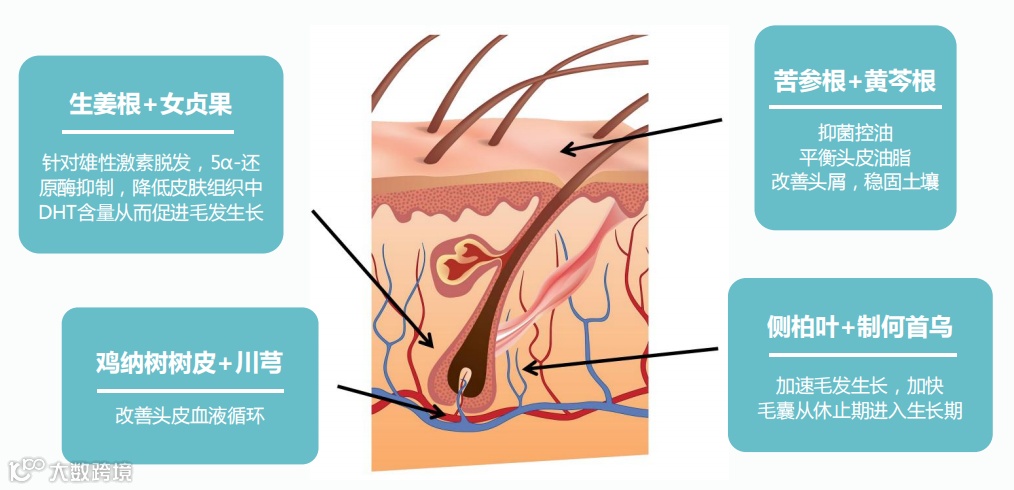 侧柏叶提取物富含黄酮类化合物,抑制5α-还原酶活性,减少二氢睾酮(DHT)生成——这是雄性激素脱发的关键诱因;女贞果提取物则强化抗氧化与抗炎效果,清除自由基,保护毛囊免受氧化应激损伤。二者协同,覆盖脱发的多因素诱因,较传统中药配方效率提升30%以上。