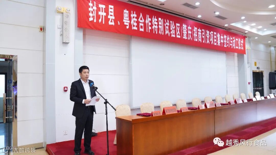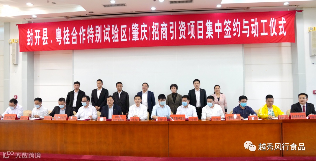 2月23日,封开县、粤桂合作特别试验区(肇庆)招商引资项目集中签约与动工仪式在封开县政府举行。越秀集团副总经理、越秀风行食品副董事长、总经理韦黎明,越秀风行食品副总经理申志明,皇上皇集团董事长陈耀,越秀风行农牧常务副总经理袁坤出席仪式。肇庆市领导林飞鸣、何琴琴、张明,封开县领导秦波、梁健梅等见证签约与动工仪式。