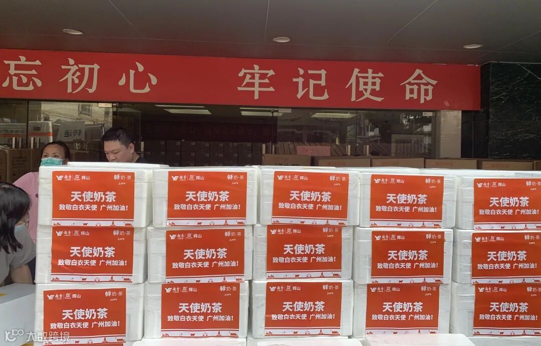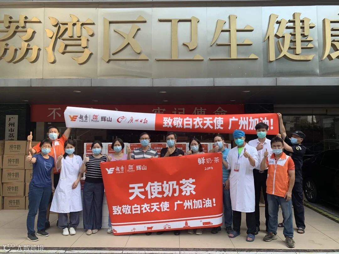 这一次,越秀辉山的鲜奶茶带着“天使奶茶致敬白衣天使,广州加油”的标语出发,跨越3000多公里的距离来到广州,为坚守在广州抗疫一线的医护人员献上爱心。