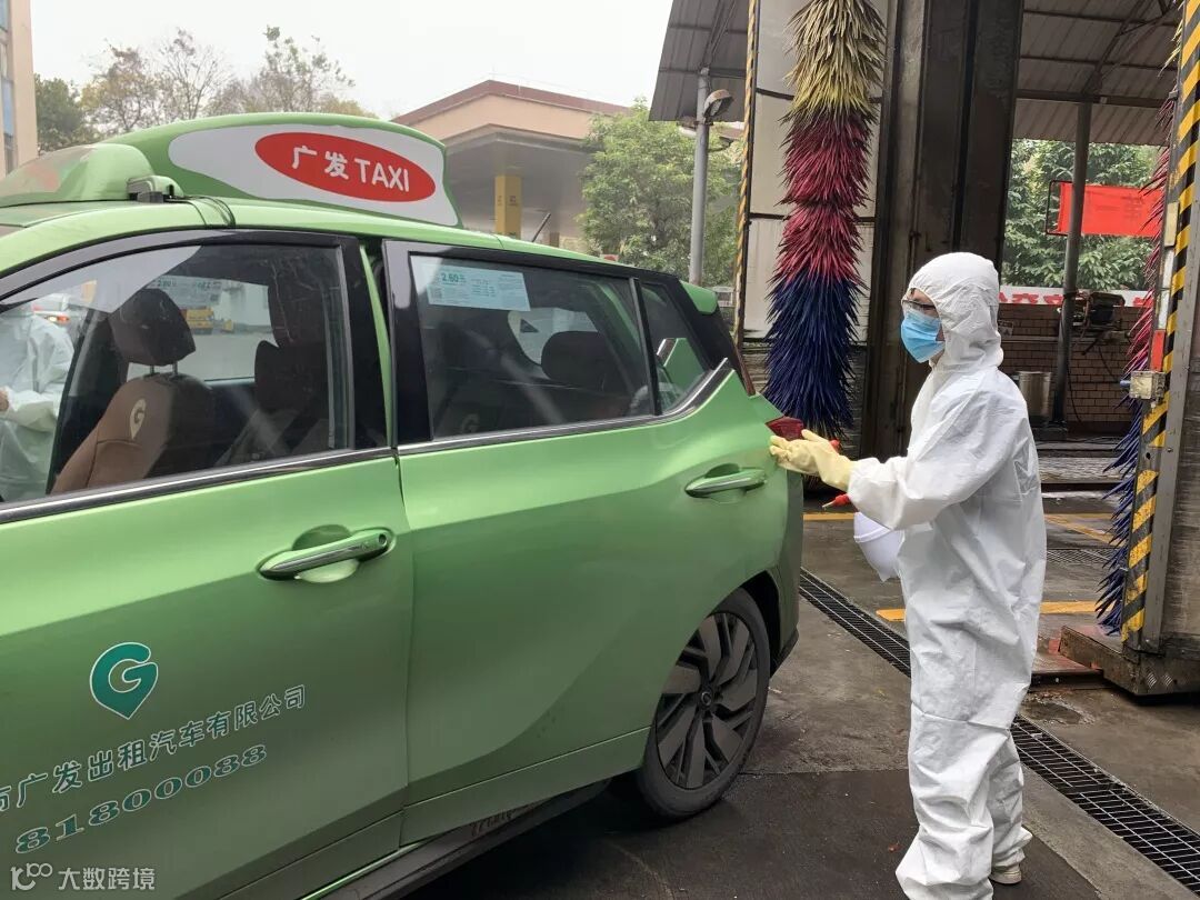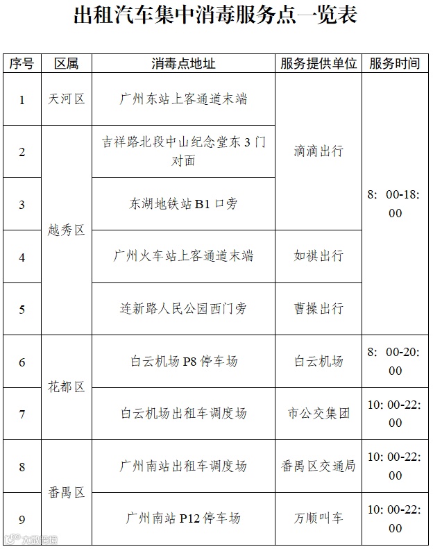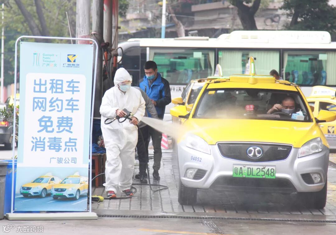 广州市交通运输部门组织设置9个出租汽车集中消毒服务点,为全市巡游车、网约车免费提供集中消毒服务。另外还有34个出租汽车企业共享自有消毒服务点(包括广骏公司大院内公益消毒点),广大司机可以前往这些点为车辆消毒。