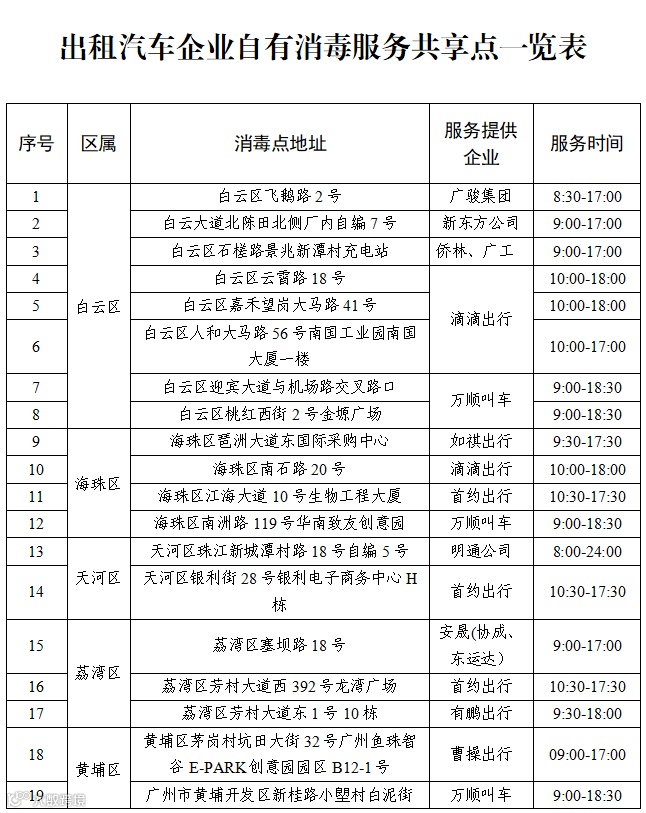 此外,为保障公司旗下全部营运车辆的安全防护,广骏公司通过多方努力与新干线养车e站达成共识,2月12日起,免费为广骏公司旗下的出租车和网约车进行车厢消毒。现今,广骏公司9个车辆消毒点遍布白云、越秀、天河、海珠、番禺等多个区(车辆消毒点详细地址见下表)。设点位置均考虑到司机日常营运区域与驾驶路径,尽最大努力为司机提供便利的消毒防护服务。