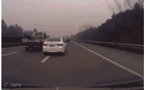 这辆白色小轿车未在安全车距下向右侧超车行驶,撞到了违章停车的大货车,随后被后面的大车二次撞击,甚是惨烈。