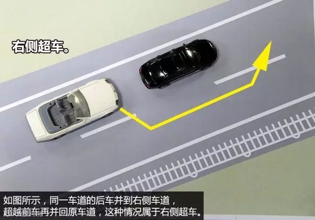 那么什么是右侧超车呢?同一车道的后车要完成超车动作,先并到右侧车道,超过前车之后再并回原车道,这种情况就算右侧超车,属于违章。