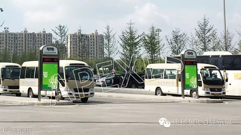 康硕展本次共提供6套显示屏用于公交商务快线站台,每套显示系统都包括用于播放视频的LED全彩屏和显示文字信息的单红屏,其中全彩屏规格为P5mm,单屏面积1.38平米,总面积约8.3平米。
