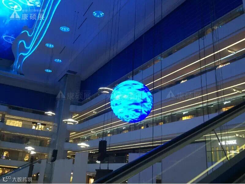 而三个不同直径的P6规格的LED球形屏,包括4米直径的LED球形屏1个,1.8米直径的LED球形屏2个,作为康硕展的专利产品,利用康硕展在LED异形屏上的技术优势,真正做到无缝拼接,并且采用均匀抽点技术,使得球形屏画面细腻逼真,这三个LED球形屏根据现场情况,或吊装和天花板上,或座装于地面,将光与艺术充分结合,与现场环境相得益彰,打造出令人震撼的光影传奇。