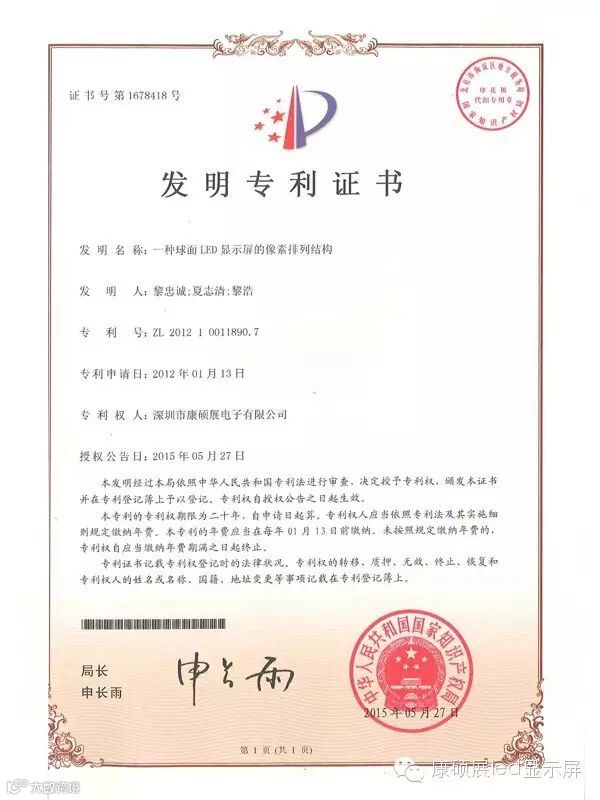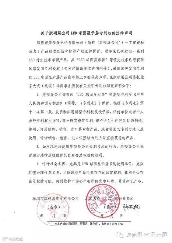 深圳市康硕展电子有限公司(简称:康硕展公司)一直重视和致力于产品技术创新和知识产权法律保护,近年来已研发出一系列LED行业技术革新产品,其“LED球面显示屏”等领先技术已经获得国家发明专利授权(专利详情请见声明附件),采用该等发明专利的LED球面显示屏产品在市场上享有较高声誉。现康硕展公司委托北京大成(武汉)律师事务所就有关发明专利权郑重声明如下: