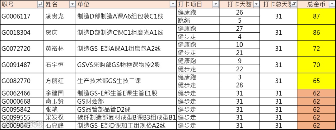 综合总金币数及打卡项目做参考标准,评选出前10名如下: