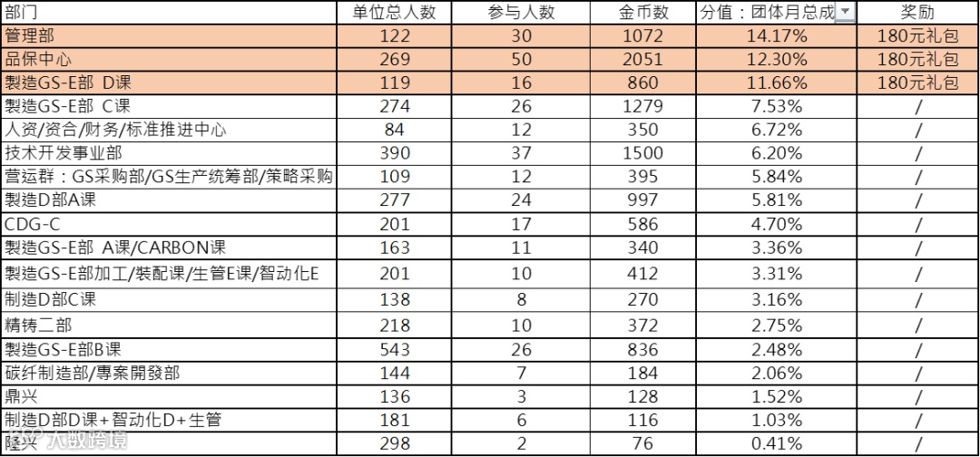 根据规则,各部门总分值均没有超过30%,一等奖和二等奖空缺,仅对超过10%分值以上的前三个部门给予奖励:管理部、品保中心、制造E部D课