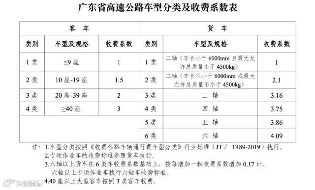1至6类货车的收费系数分别为1、2.1、3.16、3.75、3.86、4.09,专项作业车的收费标准参照货车执行。