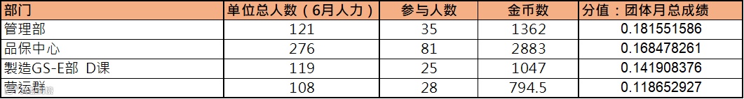 根据规则,各部门总分值均没有超过30%,一等奖和二等奖空缺,仅对超过10%分值以上的部门给予奖励:管理部、品保中心、制造E部D课、营运群。