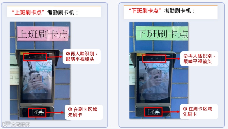 考勤刷卡必须在上、下班对应卡機進行刷卡(含中途请假),如未在规定卡机刷卡则会出現考勤异常。 举例:早上上班07:30-08:00之间打上班卡必须在”上班刷卡点”刷卡机刷卡,不能在”下班刷卡点”刷卡机刷卡,否则会出现考勤异常。