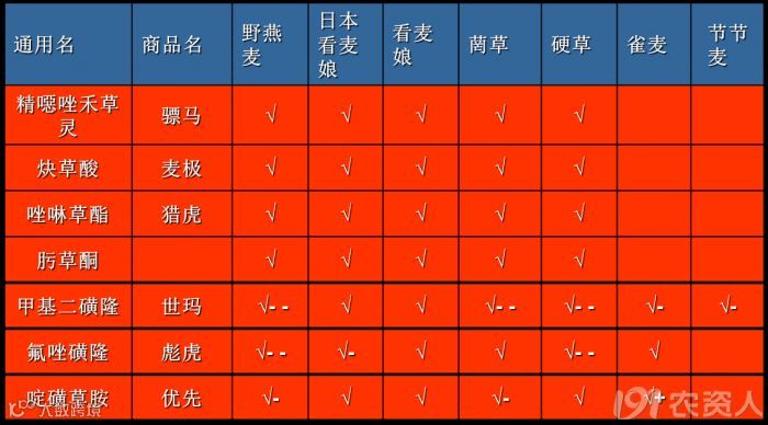 针对禾本科杂草,可选用的成分有炔草酯、唑啉草酯、精噁唑禾草灵、氟唑磺隆、啶磺草胺、甲基二磺隆、肟草酮等,每种杂草对各种成分的敏感性如下图: