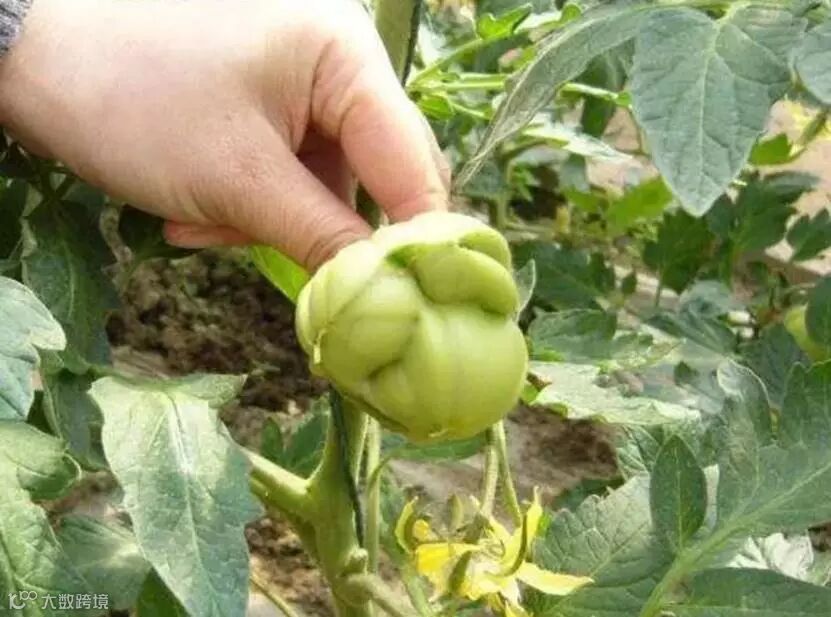 这种症状在番茄上最易出现,开始表现为花的萼片数增多,正常的植株萼片数多为6个,而畸形花萼片多为7-10个,结出的果实与正常果不同,除了果实颜色变浅、变小以外,果实还易开裂或成为多头果。