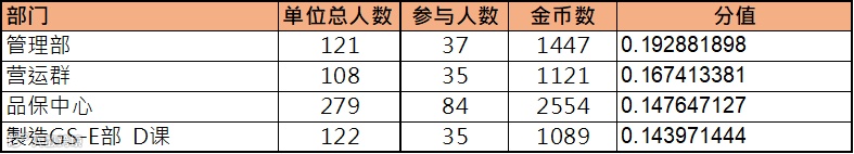 根据规则,各部门总分值均没有超过20%,一等奖和二等奖空缺,仅对超过10%分值以上的部门给予奖励:管理部、品保中心、制造E部D课、营运群。