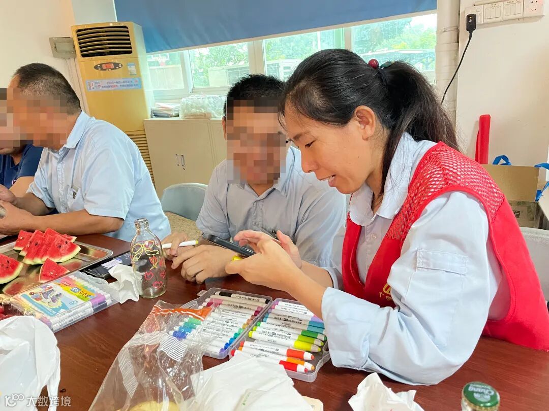 活动中,社工先介绍了本次活动的流程目的及意义,讲解了操作方法,大家在志愿者的配合下,跟着示范一步一步的描绘着,有大胆的同仁开始自己创作起来,过程中,大家认真仔细的描绘着自己的作品,希望能看得到惊喜。
