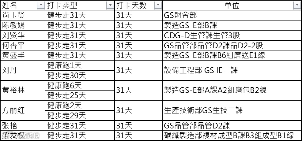 参与方式:以课/部门为团体参与挑战,个人打卡记录累计到团体成绩中,参与人数越多,打卡天数越长,越占优势。团体分组如下方表格。