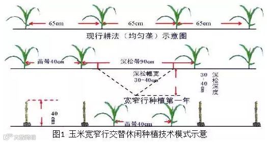 把现行耕法的均匀垄(65cm)种植,改成宽行90cm,窄行40cm种植,玉米拔节前在90cm宽行结合追肥进行深松,秋收时苗带窄行留高茬(40cm左右)。秋收后用条带旋耕机对宽行进行旋耕,达到播种状态,窄行(苗带)留高茬自然腐烂还田。