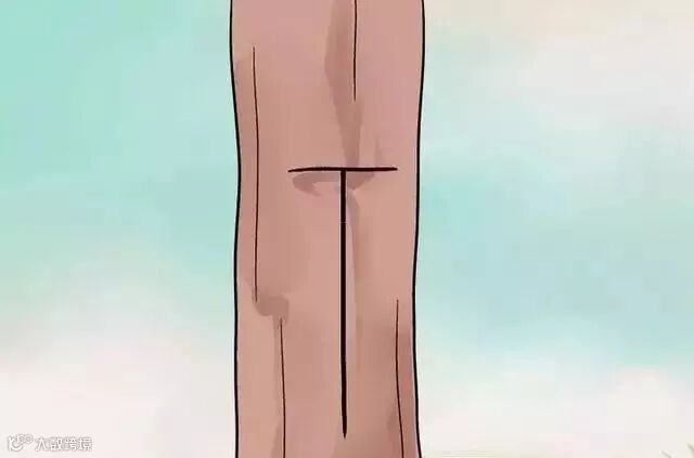 3、在你的砧木上切个T型的切口。选择分枝或者树苗上的一个地方,这个地方的直径要在0.6-2.5厘米之间。这个地方必须没有任何芽,如果能远离其他任何芽就更理想了。在树皮上做一个垂直的切片,要足够深,能暴露大约2.5厘米的绿色层。在距离砧木大约三分之一左右距离的位置做一个水平方向上差不多深的切片。把刀放到切片的连接处,转动一下让它上下移动,使绿色层可见。