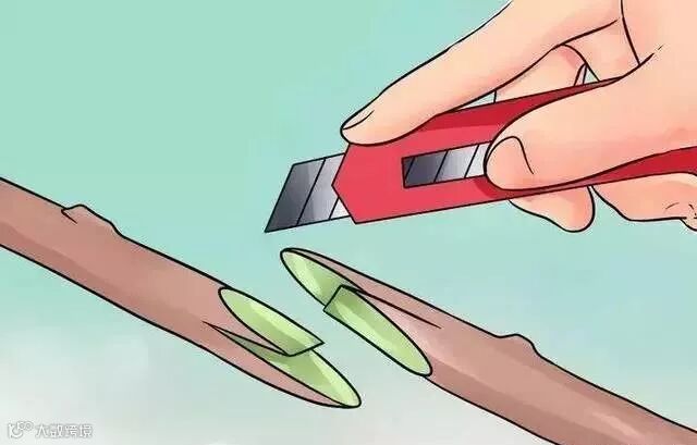 1、选择你要嫁接的植物品种和砧木。为了能够成功的嫁接,你必须从一棵健康无病的植物品种(来源树)和一棵合适的生长树(砧木)上切下一块接穗(小小的一片,为了嫁接使用)。接穗应该达到三次休眠期,或者不是正在发芽的。约0.3米长的分枝上有三至五个芽。砧木应该是平直的、光滑的,垂直枝的直径为2.5-5厘米。一旦树皮已经开始滑落(在春天当树皮很容易剥落的时候),就应该进行树皮移植了。当砧木太大不能做枝接的时候,通常用这种嫁接方式。