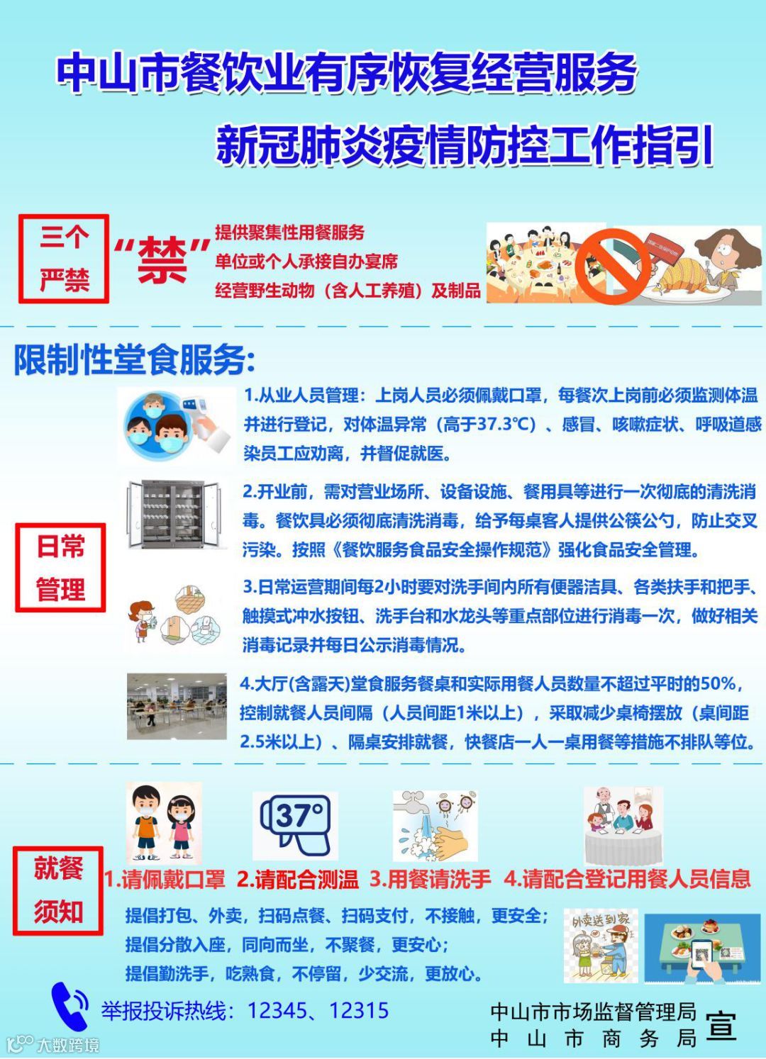 有序恢复餐饮业经营服务旨在解决社会生产、生活需求,市民进入餐厅仍须做到戴口罩、测体温、间隔1米就餐等,目前禁止举办大型宴会、集体聚餐、聚会。餐饮单位恢复营业后应加强食品安全管理,禁止使用过期、变质食品,做好食物中毒防范。