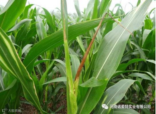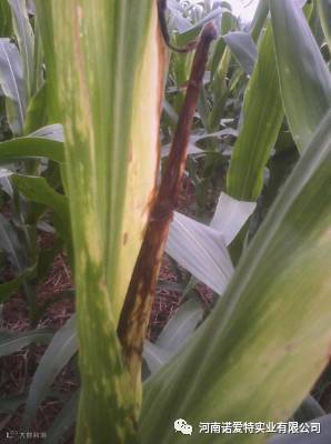 穗位节叶基和茎部发病发黄,叶鞘茎秆组织软化,植株顶端向一侧倾斜。