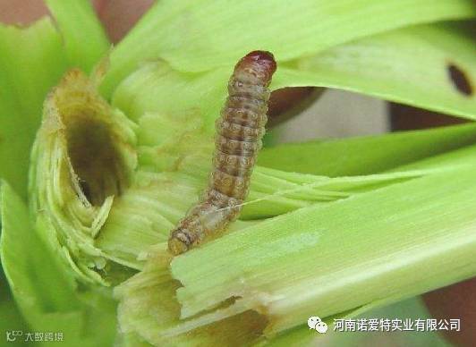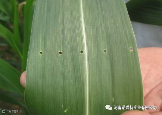 玉米螟幼虫是钻蛀性害虫,造成的典型症状是心叶被蛀穿后,展开的玉米叶出现整齐的一排排小孔。