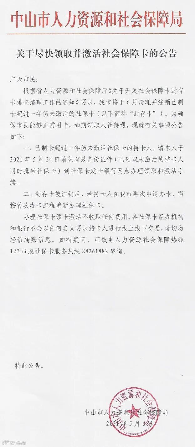 根据广东省人力资源和社会保障厅《关于开展社会保障卡封存卡排查清理工作的通知》要求,中山市将于6月开始清理并注销已制卡超过一年仍未激活的社保卡(以下简称“封存卡”)。这意味着,已领取未激活的社保卡持卡人,如果未能如期激活,将无法正常用卡,不能如期领取人社待遇。