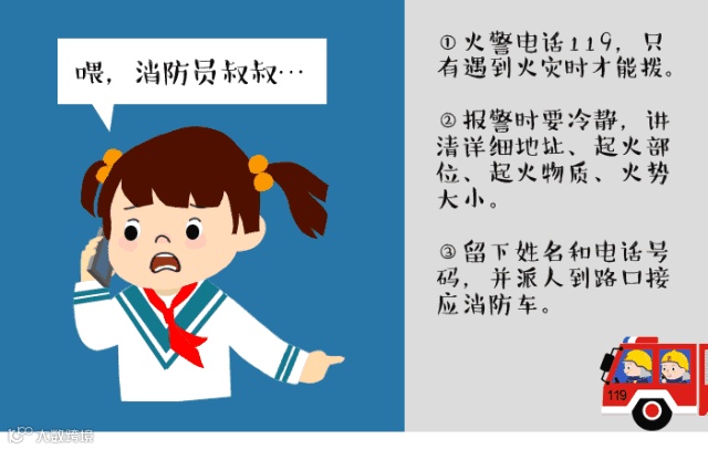 6、若火势太大,必须立即报火警“119”,需要注意的是要报告火灾地点、火势情况和自己姓名。