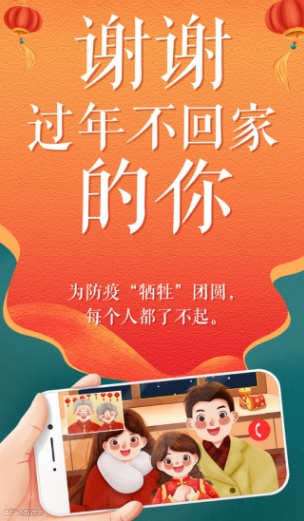 “大家好,我来自湖南,春节是每个中国人都希望团聚的日子,我也不例外,但是因为疫情原因,我也没有办法在这个节日回家跟家人团聚。其实我也思念家乡的一砖一瓦一草一木,我也想念家里的父老乡亲、爸爸妈妈、亲人朋友,但是很遗憾,在疫情没有消除情况下,我们觉得还是不要给国家和人民添乱,响应国家号召,就地过年。牛年即将到来,我首先祝国家繁荣,繁荣富强,祝人民安居乐业,祝大家财运滚滚,幸福健康。”