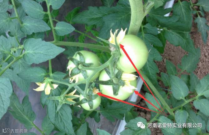 每穗第一个花开放后,后面将会有3~4个花一起生长。要预防西红柿空洞果,应在花开放前进行点花。在每穗花第一次点花后2~3天,后面将会又有4~5个花出现,此时也要点花。每穗点花8个为宜,以利于下一步精品果的选留。