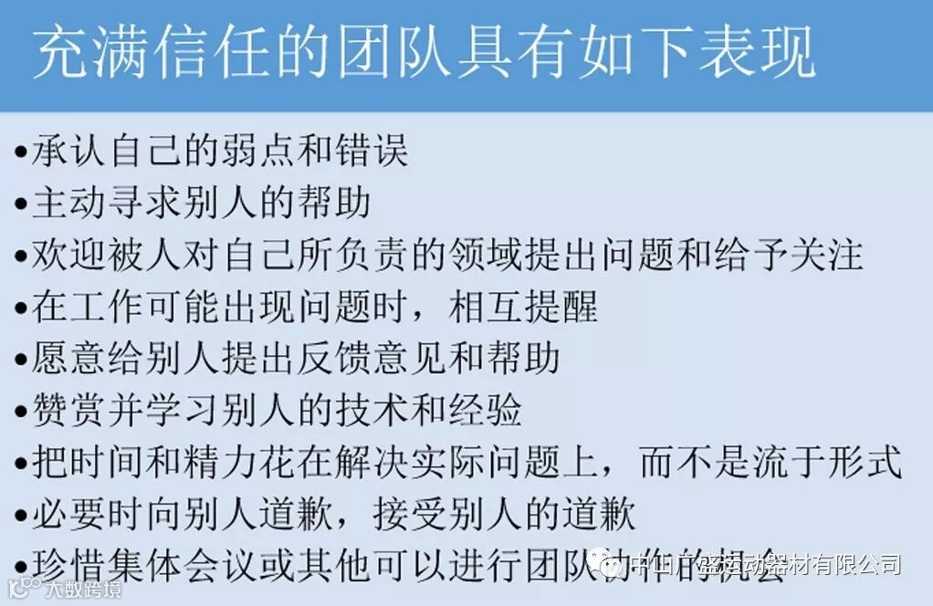 以上为突破团队第一层障碍——缺乏信任的一些方法。经过这些努力后,若您的团队开始出现如下表现,恭喜您,您的团队已跨过建立高效团队的重要一步!