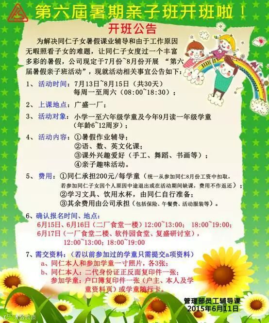 2015年第六届暑期亲子班活动报名确认啦,请已经报名参加亲子班的同仁及时提交资料,确认报名!