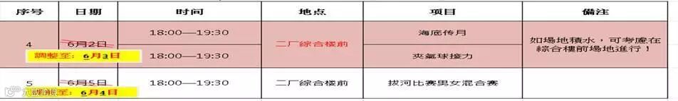 18:00—19:30 | 二厂综合楼前 | 拔河比赛男女混合 赛 |