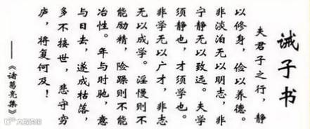 静以修身、非宁静无以致远、学须静也。诸葛亮忠告孩子宁静才能够修养身心,静思反省。不能够静下来,则不可以有效的计划未来,而且学习的首要条件,就是有宁静的环境。现代人大多数终日忙碌,你是否应在忙乱中静下来,反思人生方向?