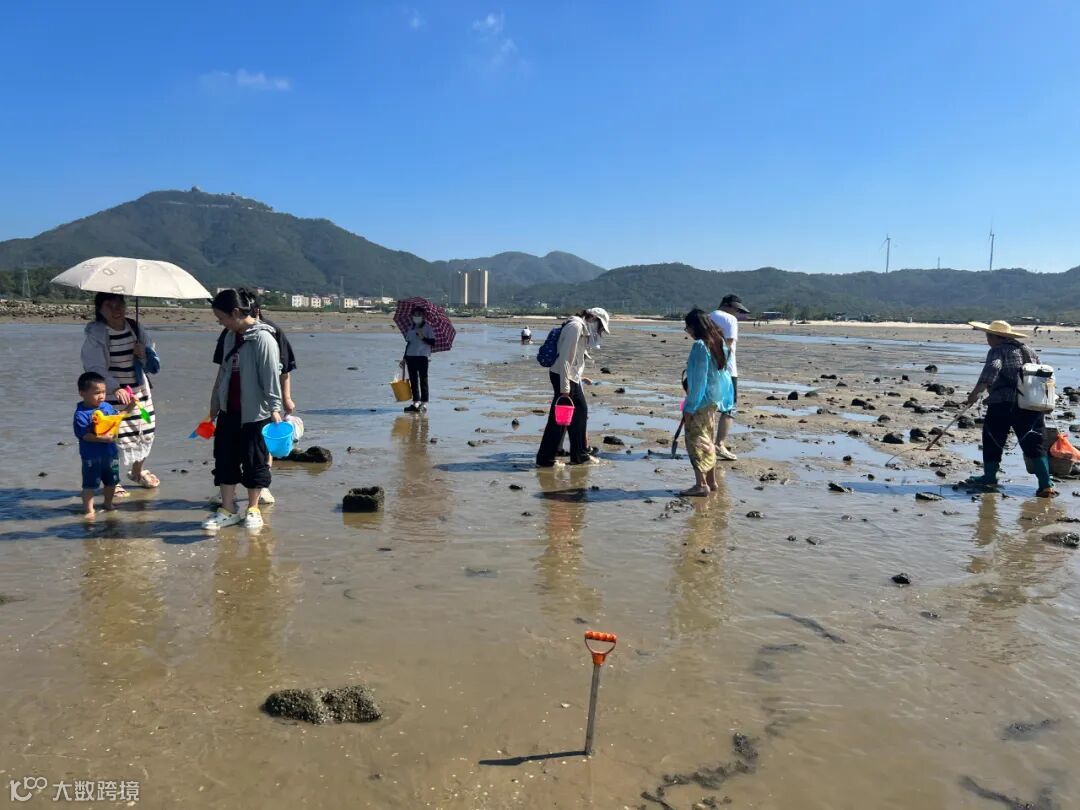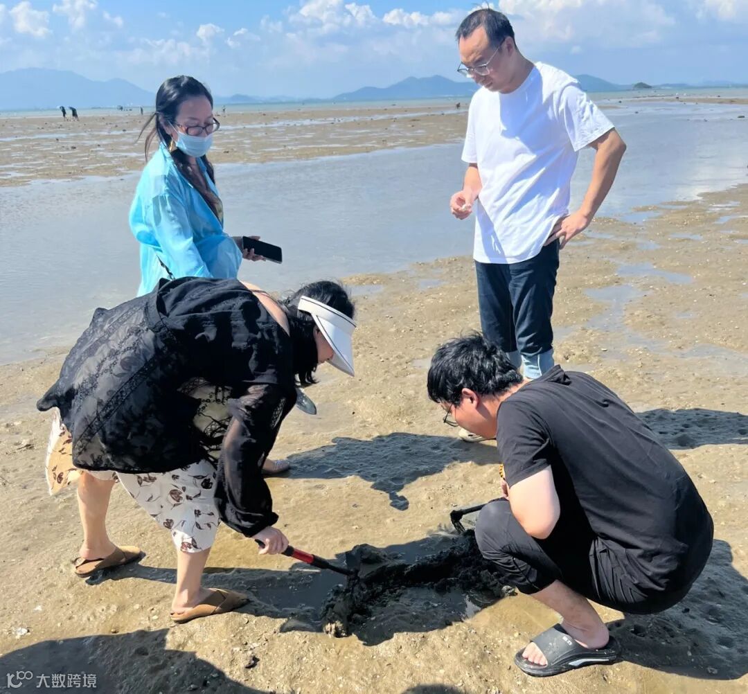 正午过后,瓦晒湾恰逢退潮,滩涂如铺展的碧色绸缎,藏满了海洋的馈赠。大家拎着小桶、握着耙子,刚踏上松软的滩涂,就被密密麻麻的 “小火山口” 吸引 。人在水洼边缘一耙,礁石缝中偶尔窜出的沙蟹,更是给赶海添了不少乐趣 。几人追着小螃蟹跑,笑声在滩涂上空回荡。大家围在一起交流技巧,有人分享 “找螺要辨呼吸孔大小”,有人传授 “挖蛤要轻耙慢翻”,协作间满是团队的默契。
